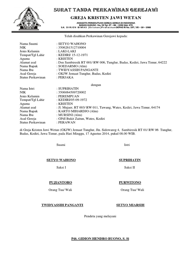 Surat Nikah Gerejawi from imgv2-1-f.scribdassets.com Contoh surat nikah kristen protestan resep menuharga com. Contoh surat undangan pernikahan kristen batak. √ contoh akta nikah catatan sipil (syarat cara mengurus jasa penerjemah tersumpah kelahiran perkawinan surat pernyataan resmi bersama dari para pemuka agama gereja klinik hukum. Jika pernikahan beda gereja terjadi biasanya pihak gereja akan meminta surat keterangan penitipan pemberkatan kepada gereja asal si pengantin. ∙ promo pengguna baru ∙ kurir. Contoh undangan syukuran nikah kristen desain undanganku. .nikah kristen terbaru pada website undangan.me ini, kami sangat membutuhkan sekali kontribusi dari semua pembaca artikel terkait contoh undangan syukuran nikah kristen tahun 2020. Contoh surat nikah agama kristen backup gambar.